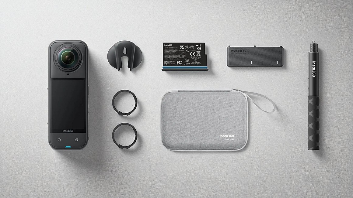 Для тех, кто хочет получить больше кадров и снимать дольше, Insta360 подготовила комплект Essentials Bundle. Кроме самой камеры X5, он включает в себя дополнительный аккумулятор, чехол для быстрой зарядки и монопод Invisible Selfie Stick с регулируемой длиной до 114 см, который не видно при съёмке. Также в него входит мягкая силиконовая крышка для объективов и защитные стёкла для линз. А удобно переносить всё это поможет фирменный чехол.