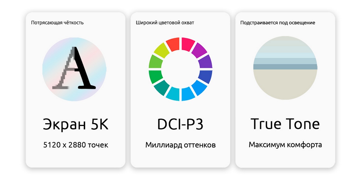 В Studio Display используется уже знакомый 27-дюймовый IPS-дисплей, который отлично зарекомендовал себя в iMac 5K, но чуть лучше. Максимальная яркость увеличилась на 20% и составляет 600 нит. Поддерживается технология True Tone и цветовое пространство DCI-P3 (до миллиарда цветов), а высокое разрешение не только обеспечивает чёткость шрифтов и возможность видеть все детали во время обработки изображений, но и позволяет монтировать видео 4K в масштабе 1:1. Традиционно для Apple, цвета монитора уже откалиброваны "из коробки".
