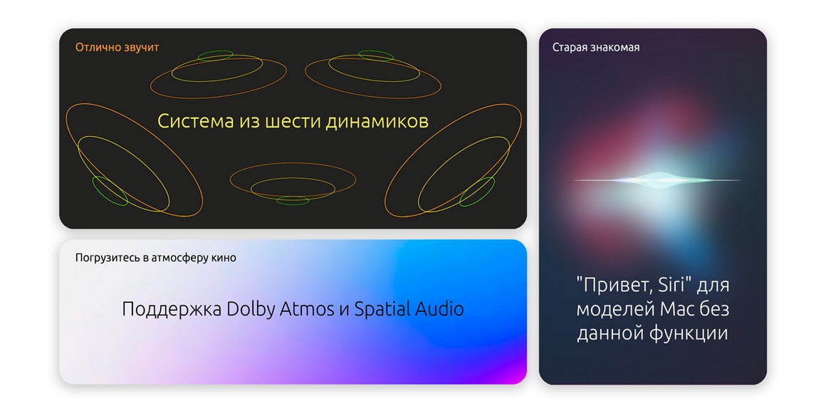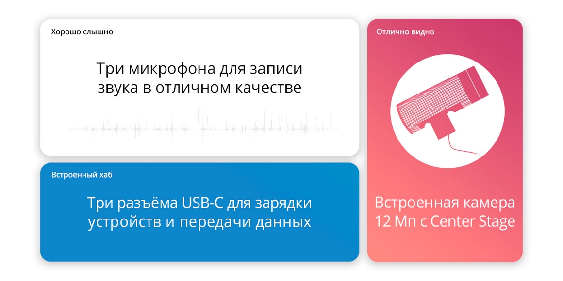 Концепция Studio Display – это моментальное превращение любого Mac в iMac 5K с возможностью менять компьютер отдельно от дисплея, поэтому в монитор встроены качественные динамики объёмного звучания с поддержкой Dolby Atmos, широкоугольная веб-камера с функцией Center Stage, которая автоматически панорамирует изображение и держит вас в центре кадра во время видеочатов, а также три микрофона с шумоподавлением. Монитор даже получил встроенный процессор A13 и способен самостоятельно обрабатывать команды Siri, поэтому фирменный голосовой ассистент безупречно работает, вне зависимости от возможностей подключённого Mac.