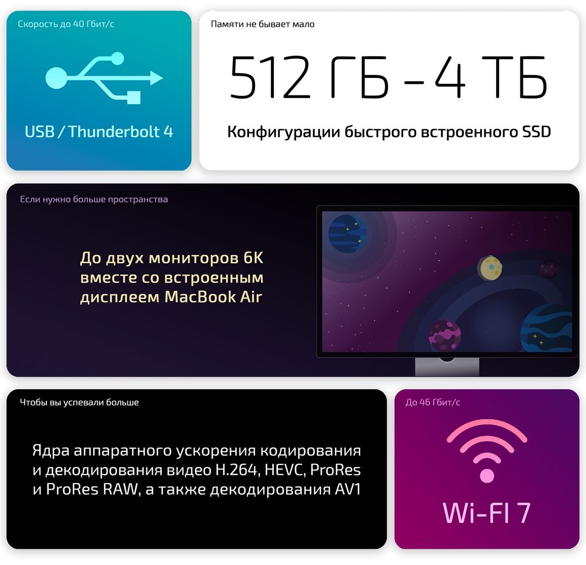 Хочется подключить большой монитор? Легко, хоть два сразу, причём в разрешении до 6K с частотой 60 Гц или 4K с частотой до 144 Гц. А если подключить один монитор, то доступны следующие параметры: 8K или 6K – до 60 Гц, 5K – до 120 Гц, 4K – до 240 Гц. Два USB-C 4 c поддержкой Thunderbolt 4 и скоростью передачи данных до 40 Гбит/с позволяют подключать быстрые внешние накопители, а для дисплеев поддерживается стандарт DisplayPort 1.4 с HBR3 и DSC. Беспроводные стандарты в моделях 2026 года тоже прокачались: Wi-Fi 7 и Bluetooth 6.