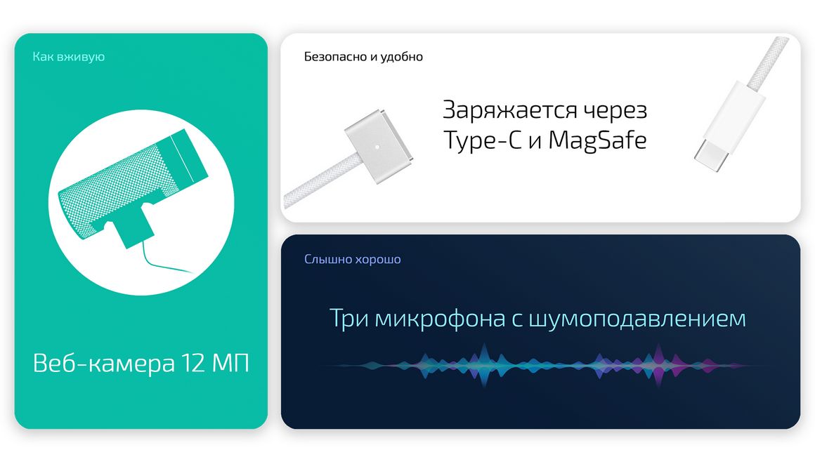 Система из четырёх динамиков обеспечивает качественный звук, которого не ожидаешь от столь компактного ноутбука. Они поддерживают Dolby Atmos, а при подключении AirPods доступно пространственное аудио с отслеживанием положения головы (если сами наушники имеют данную функцию). Для проводных наушников предусмотрен разъём 3,5 мм с поддержкой высокого импеданса. Ну а для разговоров подключать что-либо и вовсе не обязательно: все MacBook Air на базе M5 имеют три микрофона с функцией изоляции голоса.