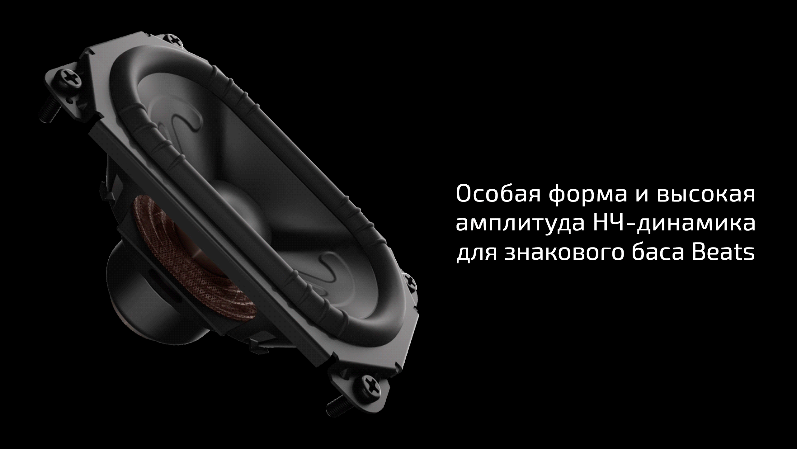 Аудиосистема Beats Pill оснащена большим, специально разработанным для неё низкочастотным динамиком в форме "гоночного круга", который перемещает на 90% больше воздушного объёма, обеспечивая более мощный и глубокий бас, а его материал и конструкция помогают минимизировать искажения на низких частотах, даже на высокой громкости.