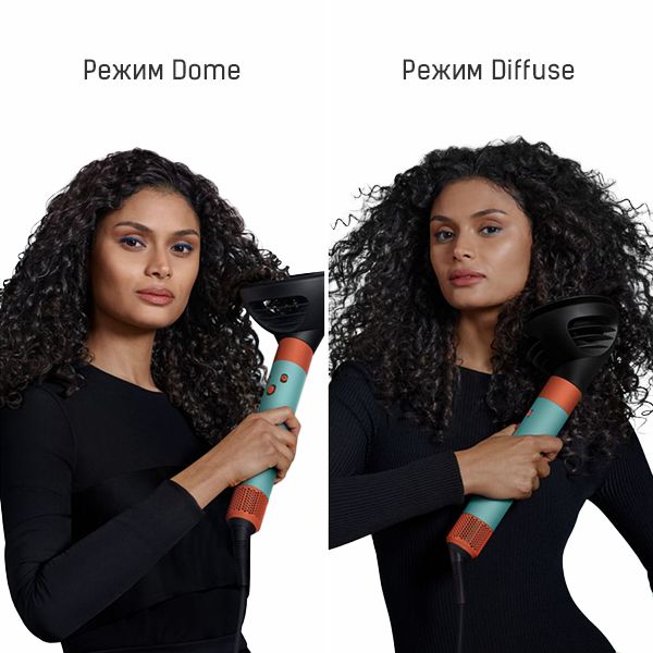 Используя эффект Коанда, диффузор направляет воздух через отверстия и прилипает к внутренней поверхности купола, направляясь к основанию. Воздушный поток сходится внизу купола, создавая мягкое завихрение. Это помогает улучшить и подчеркнуть естественные волны, придавая локонам более округлые концы.