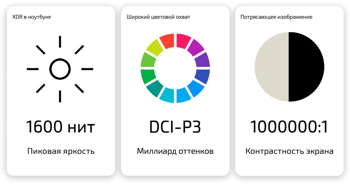 Экран Liquid Retina XDR – это профессиональный монитор с подсветкой mini-LED, который всегда с вами. Пиковая яркость до 1600 нит (общая яркость до 1000 нит), контрастность миллион к одному, миллиард цветов и динамическая частота обновления до 120 Гц для невероятной плавности (ProMotion). Конечно же, поддерживается и True Tone для комфортного использования при любом освещении и цветовая гамма P3 для профессиональной работы с цветом.