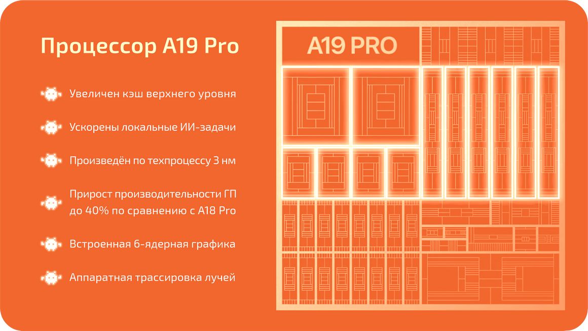 Чип A19 Pro – очередной прорыв в производительности. В повседневных задачах он быстрее предыдущего флагманского A18 Pro примерно на 10%, но графика прокачалась куда сильнее: до 40% прироста. В iPhone 17 Pro и iPhone 17 Pro Max устанавливается самая мощная версия, с 6-ядерной графикой и полным набором ускорителей машинного обучения и нейросетей. А ещё здесь 12 ГБ оперативной памяти и продуманное охлаждение: тепло отводит не только алюминиевый корпус, но и герметичная испарительная камера, изготовленная с применением лазерной пайки.