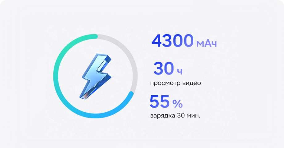 Батарея на 4300 мАч — заметный шаг вперёд для компактного смартфона. В сочетании с энергоэффективным процессором это даёт уверенную автономность на целый день.